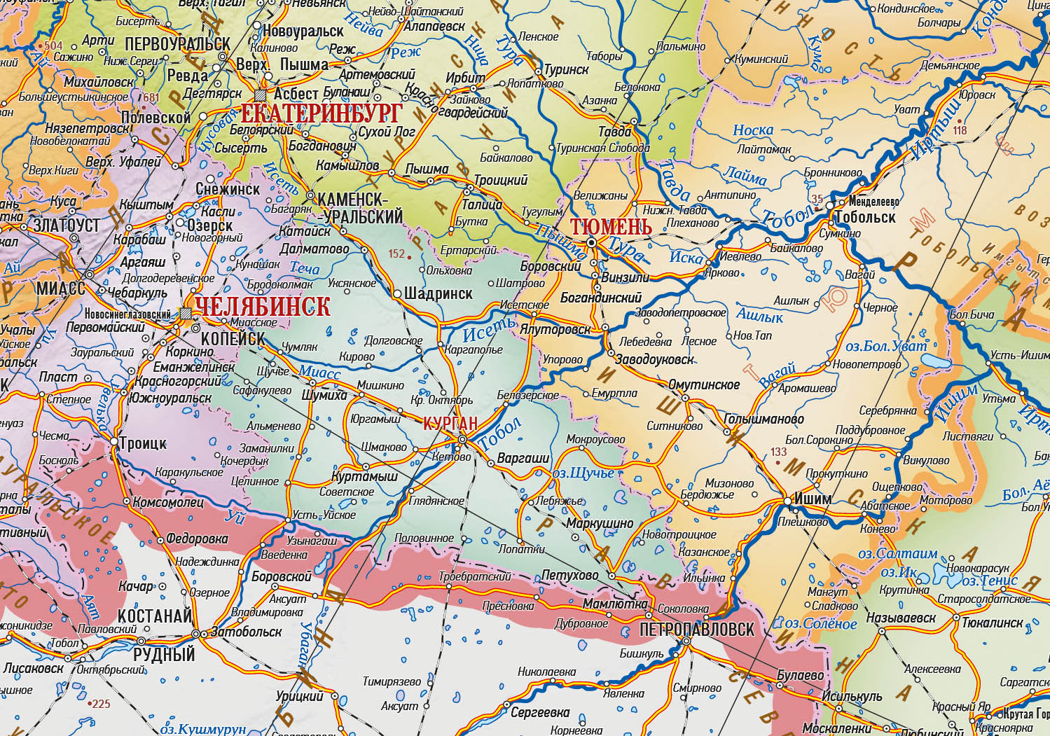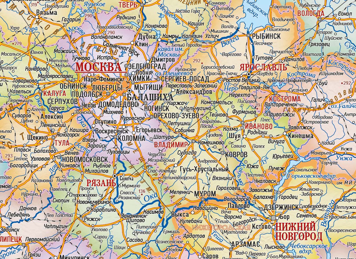 На карте представлены: Российская Федерация; страны СНГ и сопредельные государства; основные автотрассы, аэропорты и морские порты; показаны границы государств, субъектов РФ и их центры, населенные пункты