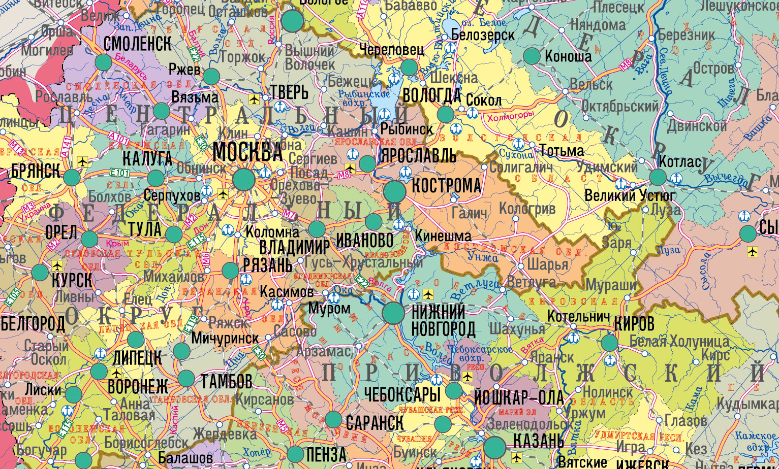 На карте представлены: Российская Федерация; основные автотрассы, аэропорты и морские порты; показаны границы государств, субъектов РФ и их центры, населенные пункты;